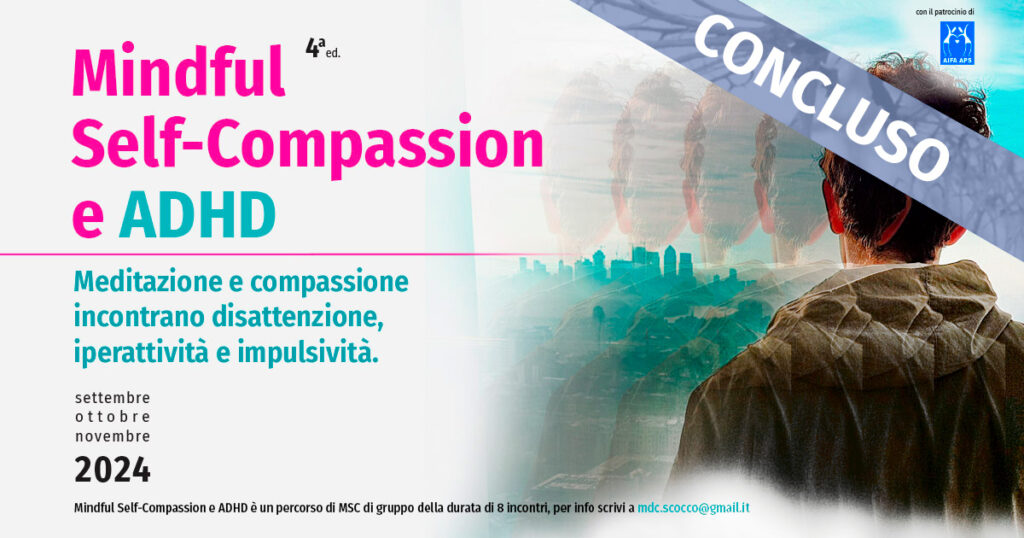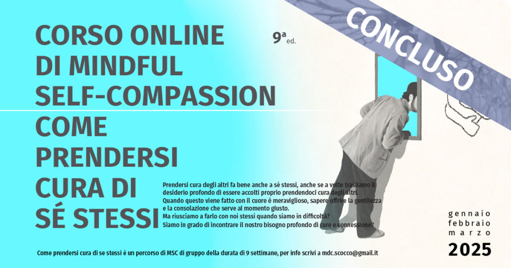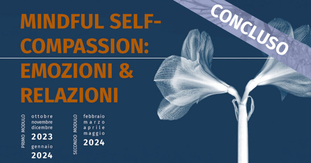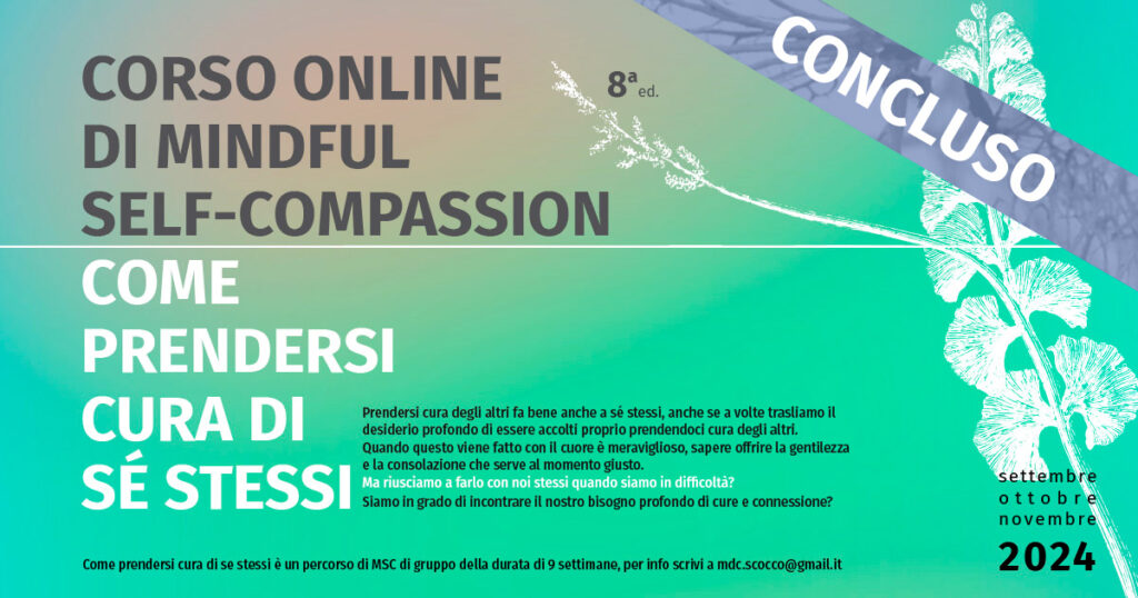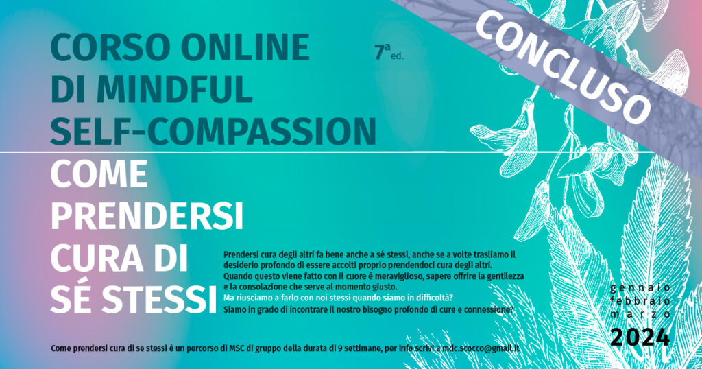 Qui sotto sono elencati i percorsi di Mindful SelfCompassion che ho già condotto e sono conclusi. Inoltre, conduco da anni anche Pánta rhêi un fine settimana residenziale di Mindful Self-Compassion dedicato a persone che vivono un lutto da suicidio. Questa esperienza facilita l’incontro, la condivisione, il mutuo supporto e lo spazio e tempo per riflettere sulla propria esperienza personale, tra persone che hanno vissuto l’esperienza di una perdita per suicidio di un loro caro (vedi Pánta rhêi)
